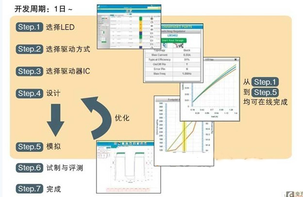 该图表示采用美国国家半导体开发的设计辅助工具“WEBENCH”进行LED照明产品设计的流程。最短可在一天内完成设计与模拟工作。以LED为代表的部件与驱动方式的选择、驱动器IC的选择以及电路设计均可在线进行,电气特性及热特性的模拟也可在线完成。